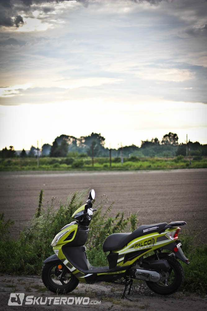 Zablokowany Barton z silnikiem dwusuwowym rozpędza się całkiem sprawnie do 55 km/h. Owszem czuć, że silnik został nieco zdławiony, ale i tak początkujący maniak skuterów będzie zadowolony z osiągów. Po dojściu do wprawy można się zdecydować na pozbycie się wszelkich kagańców. Wówczas Falcon powinien śmiało gnać do 70 km/h. Słowem, do jednostki napędowej i silnika nie można się doczepić.