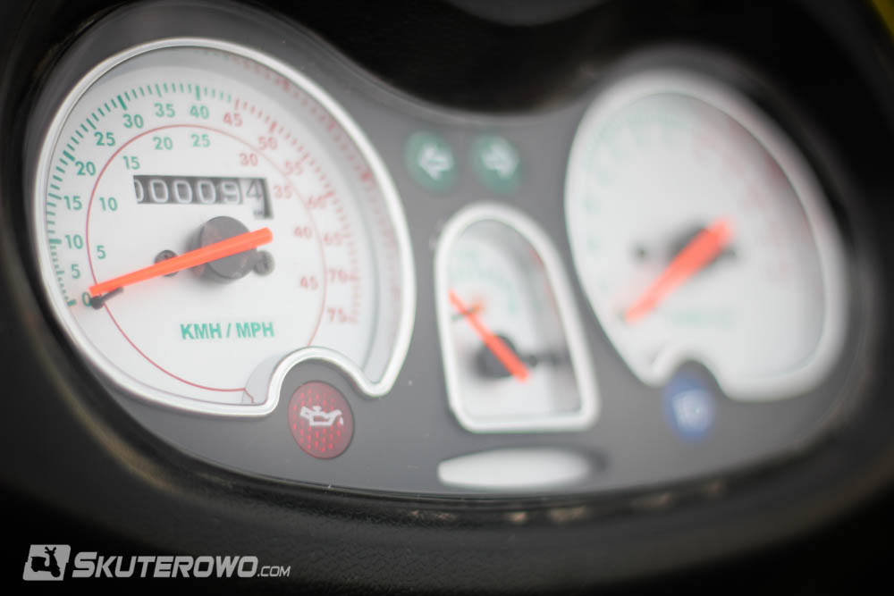 Podobnie jest z zegarami. Przejrzyste, normalne czcionki, do tego obrotomierz. Wszystko czego trzeba. Obok deski rozdzielczej mamy zestaw przełączników. Jako ciekawostkę trzeba wskazać czerwony przycisk awaryjnych. To element w który powinien być wyposażony każdy skuter. To naprawdę może się przydać w kryzysowej sytuacji. Nie mówiąc już o możliwości dziękowania nimi uprzejmym kierowcom. Np w korku…