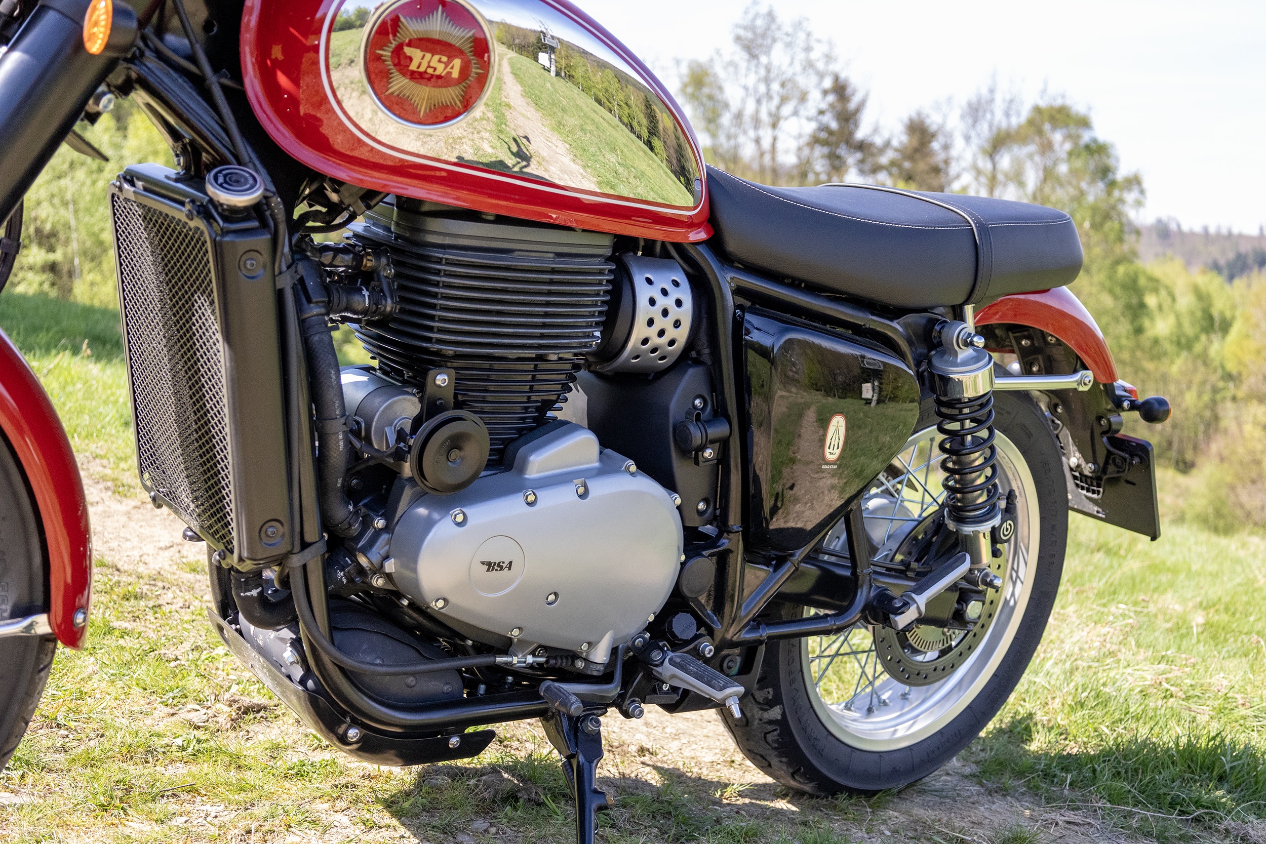 Współczesna BSA Gold Star 650 jest napędzana największym produkowanym w historii marki silnikiem jednocylindrowym. Jeden garnek o sporej pojemności to znak rozpoznawczy nowego Gold Stara i rzecz wyróżniająca ten motocykl na tle obecnej na rynku klasycznej konkurencji. Spora pojemność przenosi się bezpośrednio na niezłe osiągi i przyjemną dynamikę podczas jazdy. Tu nie trzeba czekać by silnik wkręcił się na obroty, wystrzeliwując motocykl do przodu. Moc 45 KM osiągana jest przy 6000 obr./min. Z kolei maksymalny moment obrotowy dostępny jest już przy 4 tysiącach obrotów i wynosi przyjemne 55 Nm. Trzeba też dodać, że silnik, choć stylizowany jest mocno na lata minione i całkiem zręcznie udaje konstrukcję przedpotopową, okazuje się całkowicie współczesnym wytworem inżynierii. Objawia się to nie tylko w chłodzeniu cieczą, czterozaworowej głowicy, czy układzie zasilania z elektronicznym wtryskiem, ale w samym charakterze pracy. Nie mamy tu do czynienia z tak charakterystyczną dla motocykli klasycznych „długoskokowością”, przekładającą się w skrócie na mocniejszy dół i zadyszkę na górze. Ten piec pracuje całkowicie współcześnie. Na szczęście jest jednocylindrówką, więc siłą rzeczy daje do dyspozycji mocny środek. Pięciobiegowa skrzynia jest dobrze zestopniowana, co pozwala przyjemnie korzystać ze wspomnianych walorów singla. Nie jest to może najbardziej precyzyjna skrzynka z jaką miałem do czynienia, ale działa bez zarzutu. Jedyne czego nie jestem fanem w jej konstrukcji to fakt, że przy skrajnych biegach, dźwignia nie stawia oporu i nadal wykonuje ruch w stronę jeszcze wyższego, lub jeszcze niższego biegu, które przecież nie istnieją. Walisz więc po kilka razy dźwignią w poszukiwaniu kolejnych biegów, by się upewnić, że to na pewno „piątka”. Jednocylindrowa 650-tka nie jest łakoma. Nawet przy dynamicznej jeździe potrafiła zmieścić się w czterech litrach. Szkoda tylko, że wskaźnik paliwa jest co najwyżej orientacyjny.