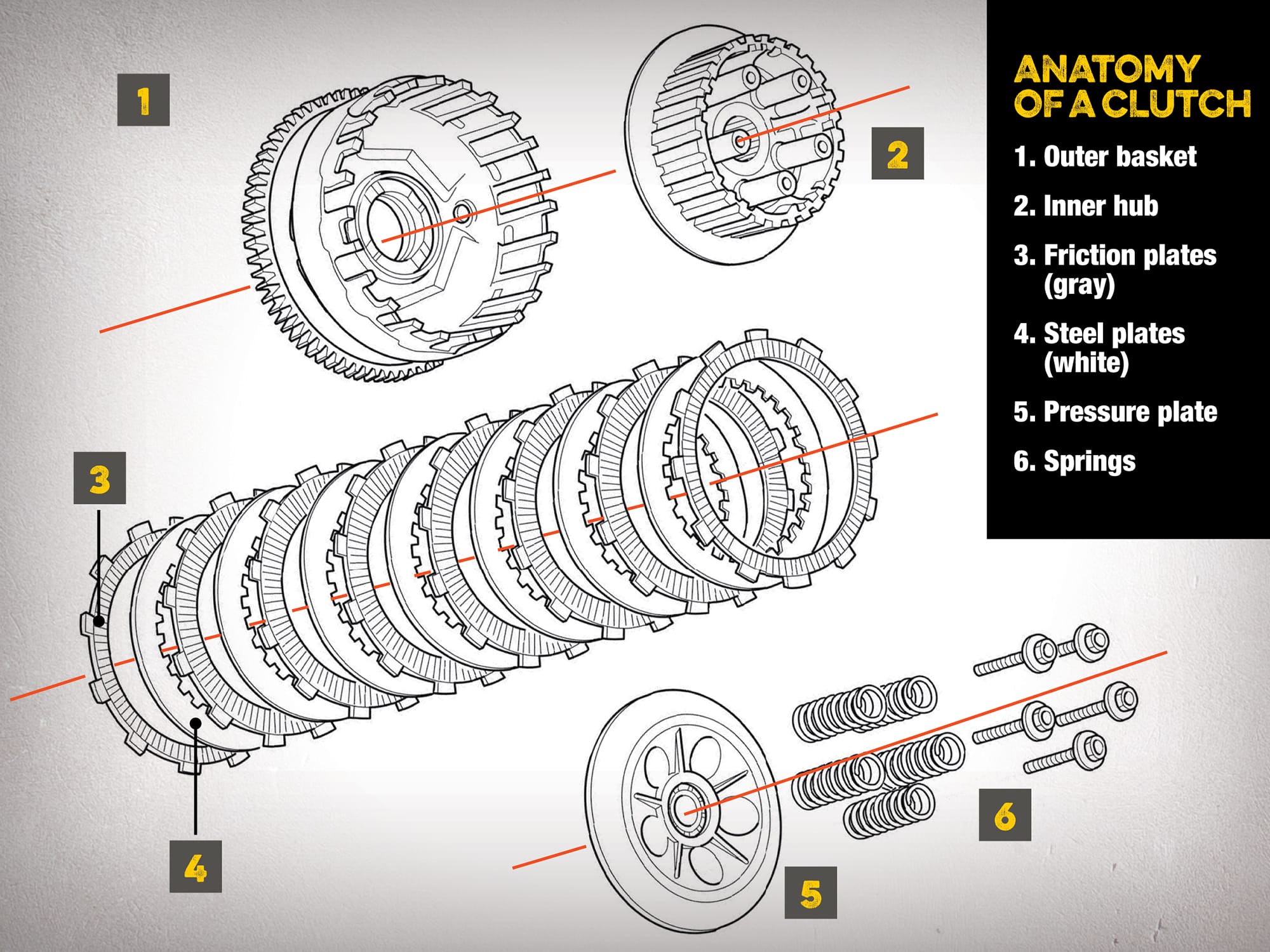 Gdyby w motocyklach nie było nawet najprostszego sprzęgła to ten ruszałby już w momencie wrzucenia biegu, a jego zatrzymanie byłoby praktycznie niemożliwe. Owszem, znacznie słabsze jednostki napędowe zapewno zgasłyby, jednakże te znacznie mocniejsze nadal jechałyby do przodu uniemożliwiając bezpieczne hamowanie do zerowej prędkości. Sama konstrukcja sprzęgieł niewiele zmieniła się na przestrzeni lat i nadal sama budowa jest podobna – składają się one z tarcz, przekładek i sprężyn dociskowych, jednakże z tą różnicą, że jeszcze kilkadziesiąt lat temu pracowały one „na sucho”. Obecnie zdecydowana większość producentów decyduje się jednak na montaż sprzęgieł wielopłytkowych w kąpieli olejowej, co bezpośrednio ma wpłynąć na ich mniejsze zużycie, ale również większą efektywność działania.