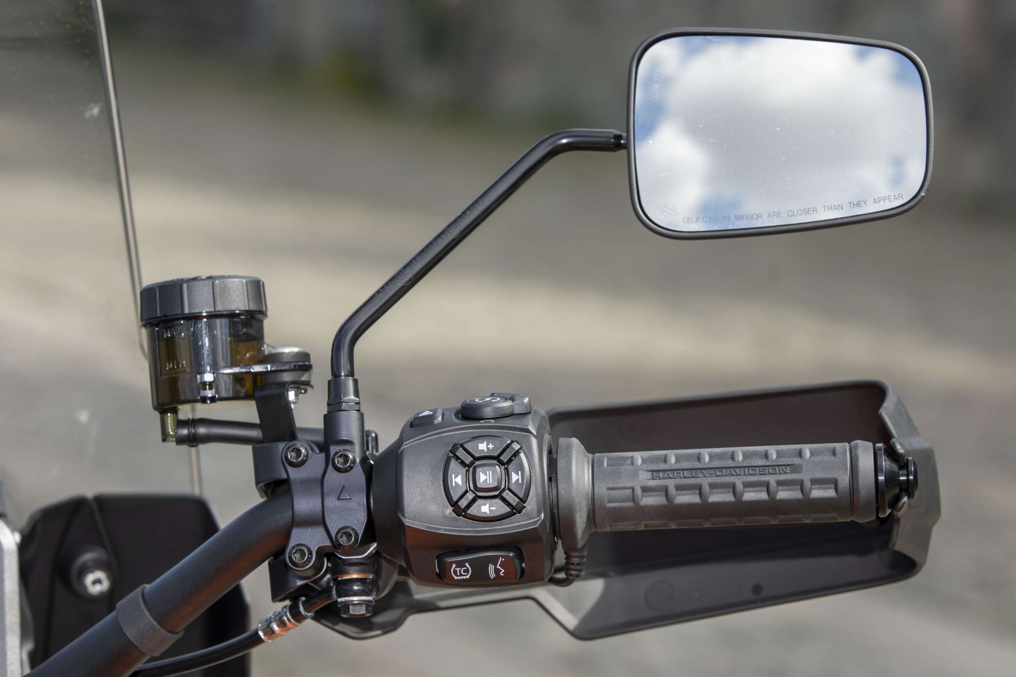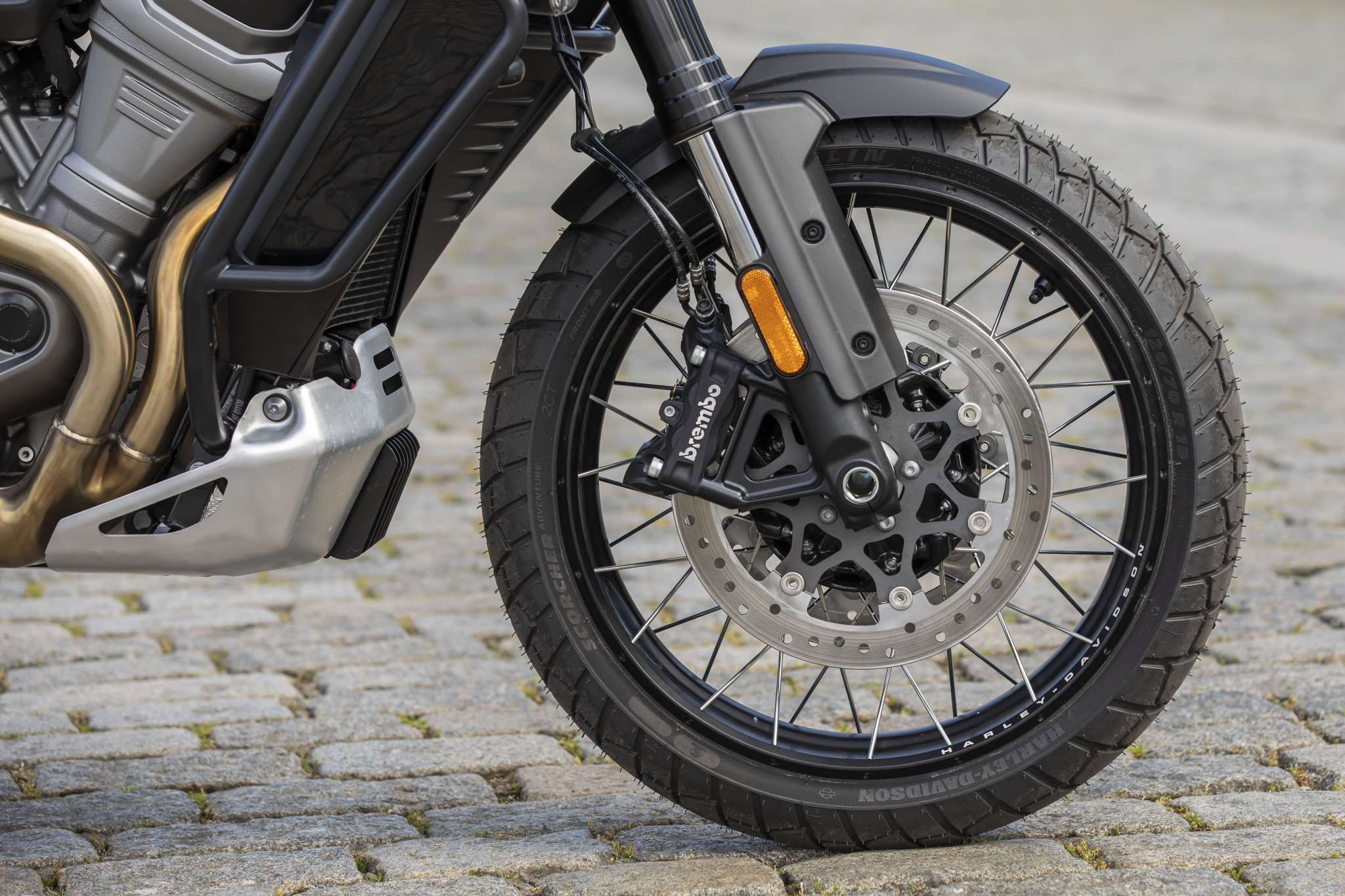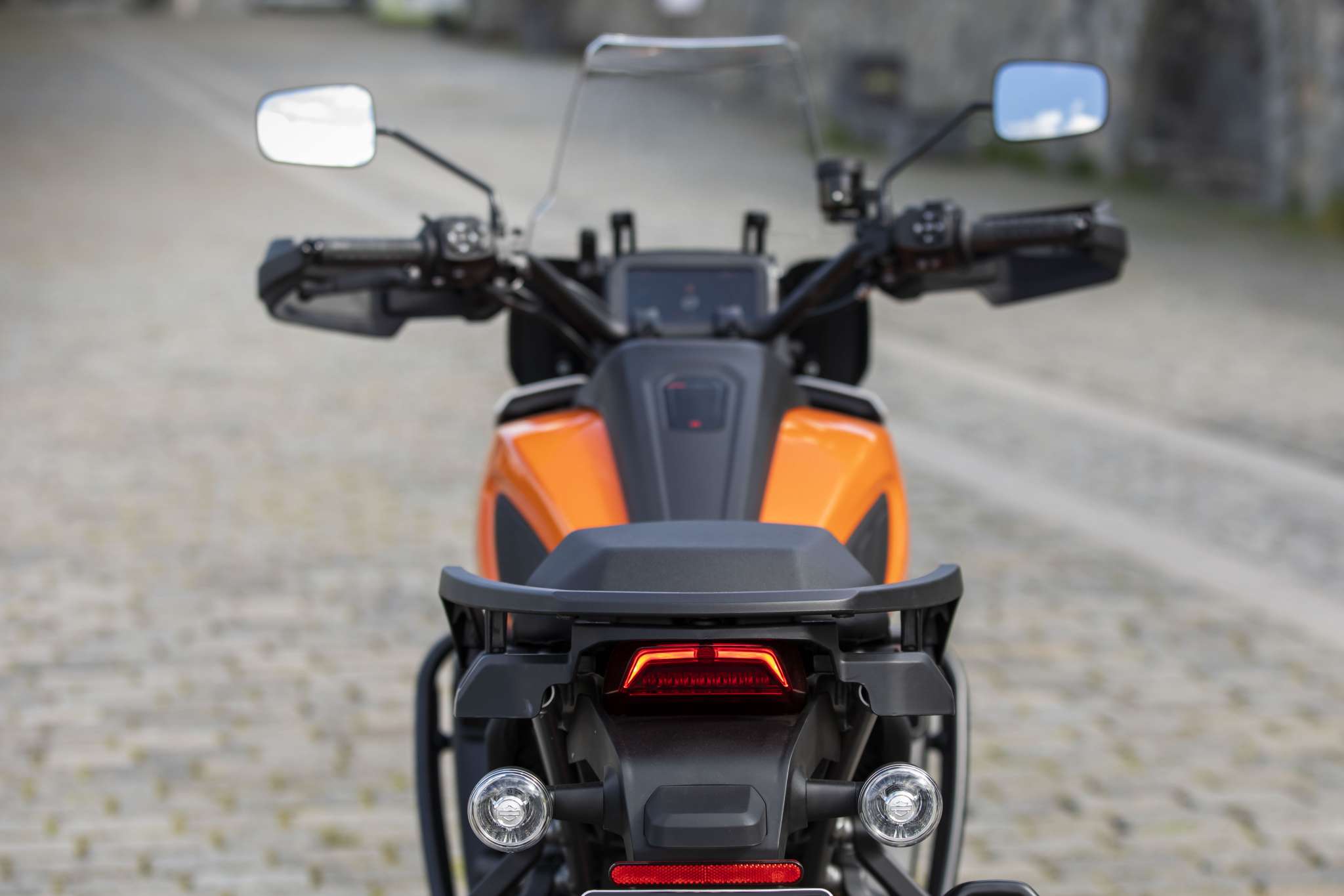 Co nie przypadło mi do gustu? Chociażby fakt, że mając bezkluczykowy zapłon i tak musisz wozić ze sobą kluczyk do blokady kierownicy, czy żeby dostać się do zbiornika paliwa i schowka. Stelaż regulowanej przedniej szyby również nie wzbudził mojego zaufania. Wygląda tandetnie i ciężko mu wróżyć długie bezawaryjne życie, choć może się mylę, bo nie każdy przecież wachluje co chwilę szybą. Możliwe jest użycie regulacji podczas jazdy, bo obsługuje się go jedną ręką, ale jego filigranowa konstrukcja sprawia, że ciężko wybrać ustawienia pośrednie w trakcie poruszania się. Trochę martwią mnie również wystające z cewki umieszczonej klasycznie dla Harleya przewody zapłonowe oraz kabelki przy regulatorach półaktywnego zawiasu z przodu. w terenie, wśród krzaków, łatwo uszkodzić takie elementy. Nisko umieszczona chłodnica może z kolei grzać dość mocno piszczele i stopy podczas wolnej jazdy w cieplejsze dni. Z kolei fajnie, że podnóżki mają wypinane gumki i że można je przełożyć do podnóżków pasażera jesli jeździsz solo. Podoba się także szybka regulacja położenia dźwigni hamulca tylnego. Obydwie klamki także posiadają regulacje, hamulce są dobrze dozowalne i dają dobry feedback, a wąski zbiornik z gumowymi nakładkami pomaga w wygodnym uchwycie motocykla podczas jazdy na stojąco.