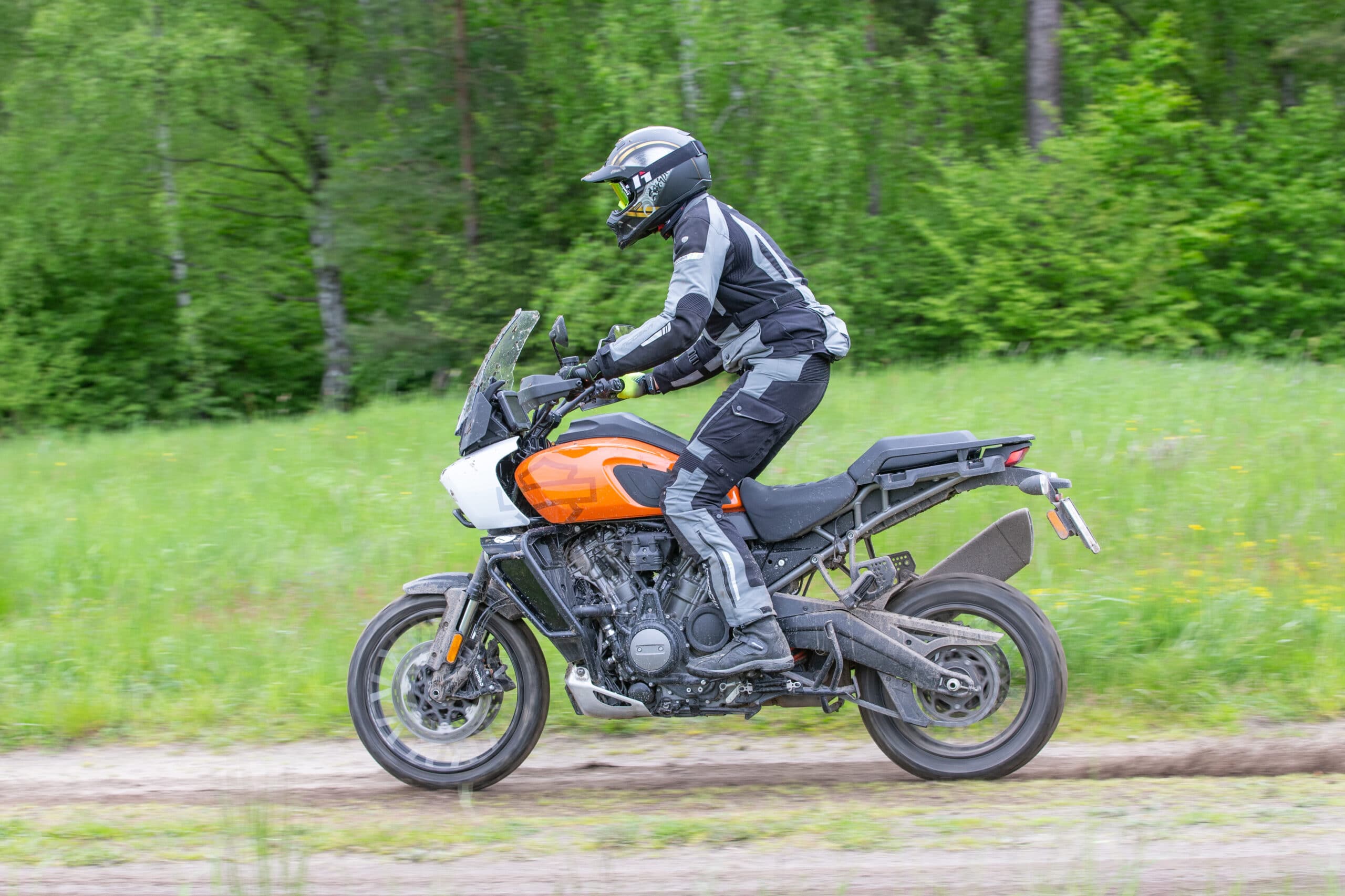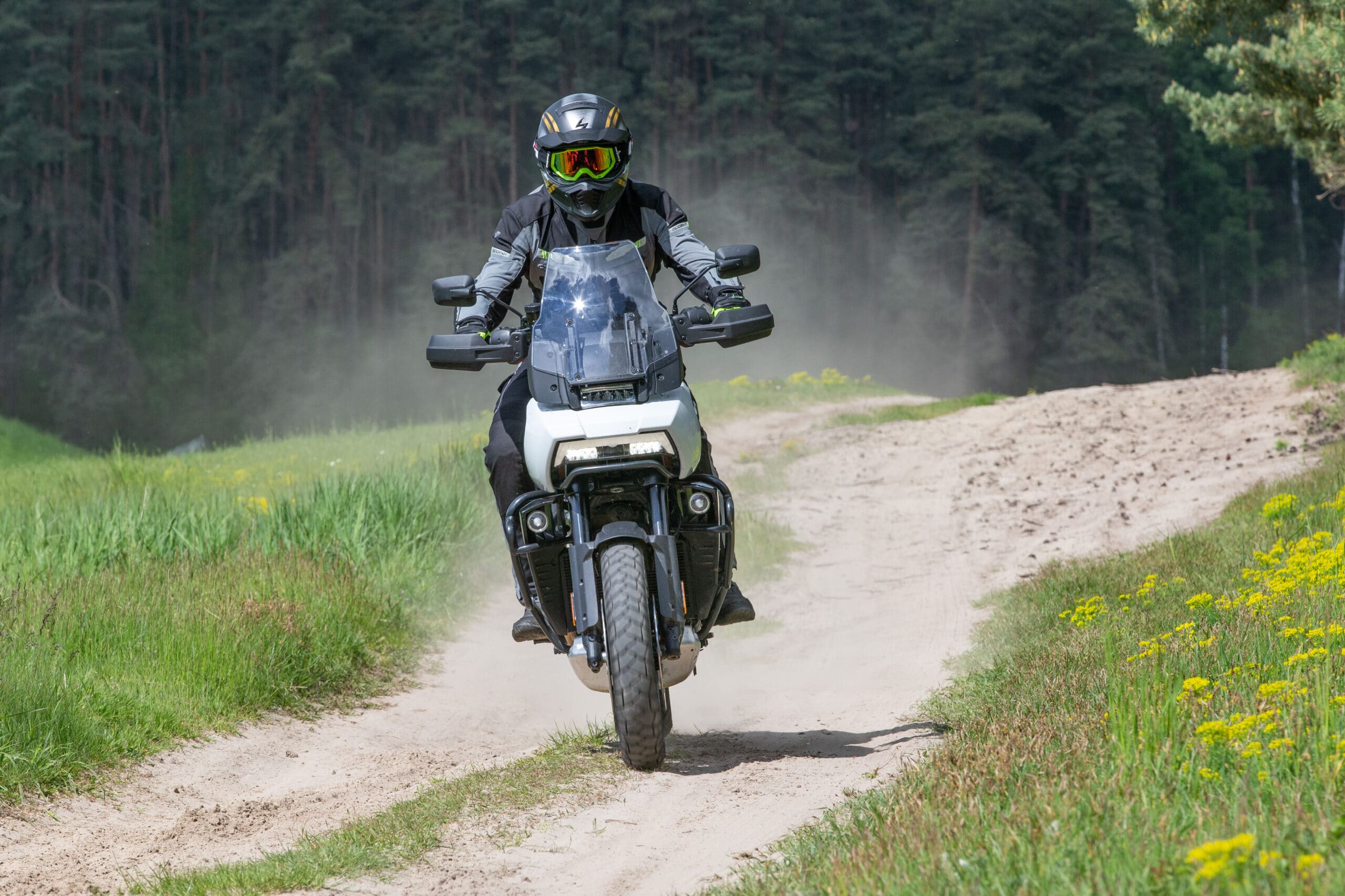 Pan America ma spory jak na tę klasę rozstaw osi. To w połączeniu z autorską geometrią podwozia powoduje, że motocykl nie należy do sprzętów tnących zakręty jak po sznurku. Nie ma to moim zdaniem nic wspólnego z klocem walącym się w zakręty – Pan Americą można naprawdę fajnie i pewnie kręcić górskie serpentyny, ale nowoczesne konstrukcje obecne na rynku przyzwyczaiły mnie po prostu do większej neutralności. Z kolei spory rozstaw osi okazuje się być zaletą w terenie. Motocykl jest dzięki temu bardziej stabilny i sprawia wrażenie maszyny lżejszej niż w rzeczywistości. To wrażenie potęguje także dość wąski zbiornik paliwa, dzięki czemu nie masz wrażenie jazdy kolosem. Pan America 1250 w wersji Special waży 258 kg z płynami. Dla porównania bawarski GS 1250 ustawia się lekko pod 250 kg ale w wersji podstawowej. Można zatem powiedzieć, że jest całkiem podobnie. Jednak duży GS w obcowaniu sprawia wrażenie motocykla większego, bardziej rozbudowanego. Smukłość sylwetki sporo zmienia, mimo, że nadal masz do czynienia z ponad ćwierćtonowym koniem. Włączając dostępny w wersji Special tryb Enduro Plus, możesz wybrać ustawienia zawieszeń soft i hard oraz wyłączyć całkowicie ABS przy tylnym kole. Możesz także zrezygnować z kontroli trakcji, lub pozostawić ją w pozwalającym na uślizgi trybie enduro. Przy takich ustawieniach można całkiem dobrze pobawić się na szutrówkach i w mniej wymagającym terenie i to na fabrycznych oponach Michelin Scorcher Adventure, które zaskakująco dobrze radzą sobie dopóki nie zrobi się kopnie i nie pojawi się błoto. W tych warunkach przednie koło zaczyna żyć własnym życiem. Na bardziej ambitne zabawy w terenie Harley przygotował sygnowane opony Michelin Anakee Wild oraz dostępne w opcji szprychowe bezdętkowe obręcze. Wtedy we wprawnych rękach ten amerykański wszędołaz może okazać się całkiem sprawnym motocyklem do zabawy na różnego rodzaju leśnych duktach. A prawdziwy off-road zostawmy motocyklom, które zostały do tego stworzone.