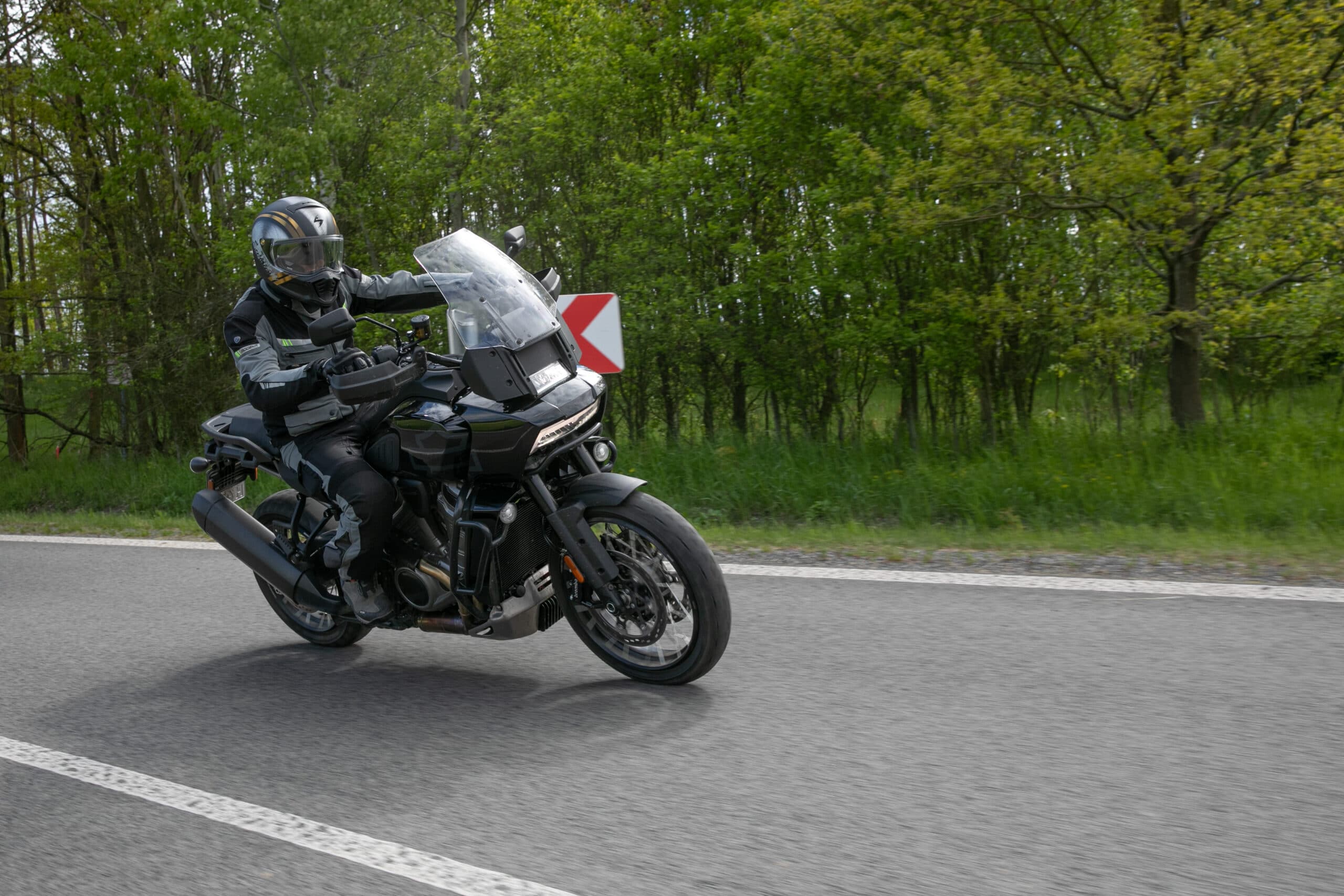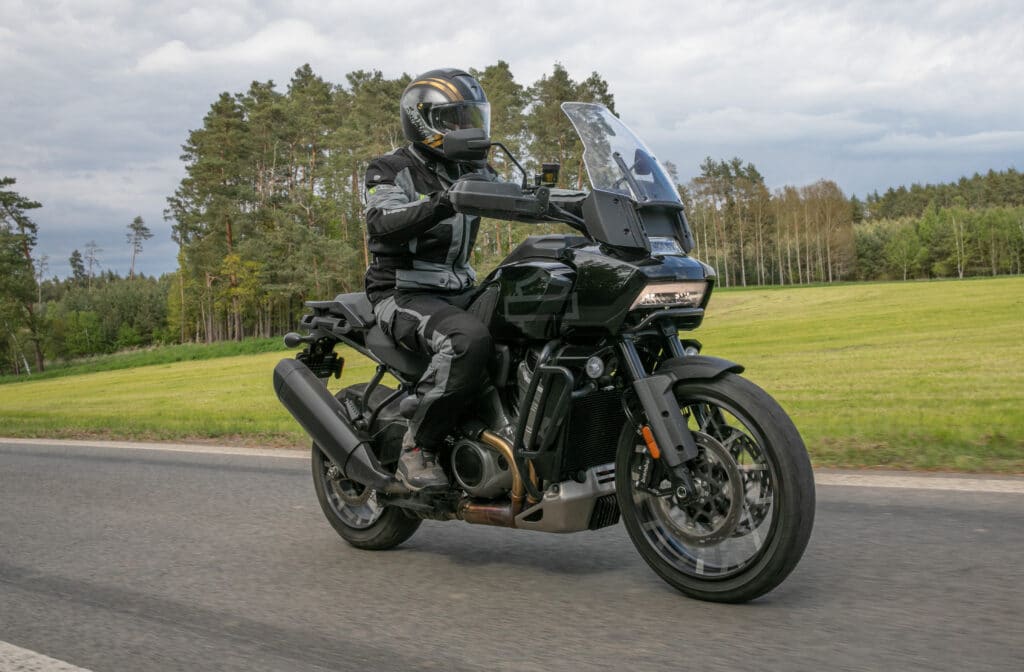 To co mnie najbardziej zdziwiło w tym motocyklu to chyba właśnie sam napęd i jego charakterystyka. Nie przypuszczałem, że jakiegokolwiek Harleya trzeba będzie tak wysoko kręcić, by wchodzić w prędkości nadświetlne. Ma to swoje złe i dobre strony, bo o ile ja wolę mocny dół, o tyle osoby, którym nie zależy na wysokiej dynamice i narowistości dostępnej od zaraz i wszędzie, nie zostaną onieśmielone przez potencjał napędu. Pan America naprawdę potrafi rozciągnąć stawy rąk przy przyspieszaniu, ale zrobi to dopiero wówczas, gdy zostanie o to wyraźnie poproszona. Tak naprawdę, jeśli będziesz operować w zakresie obrotów 3-6 tysięcy, to motocykl ten jest superogarnialny nawet przez mniej doświadczone osoby. I to w trybie jazdy Sport. Wystarczy jednak szybka redukcja całkiem nieźle zestrojonej skrzyni biegów i mocniejsze odwinięcie manetki, by poczuć solidne uderzenie. 128 Nm przy 6750 oraz 152 KM przy niecałych 9 tysiącach potrafią sponiewierać. Mam jednak wrażenie, że konkurencja może się pochwalić szerszym zakresem wysokiej dynamiki. Jednak dla każdego coś dobrego. Co ciekawe, w momencie zejścia na 6. biegu do prędkości obrotowych poniżej 2 tysięcy i mocnym odwinięciu gazu nie następuje szarpanie. Elektronika i wszystkie systemy, na czele ze zmeinnymi fazami rozrządu, robią co mogą by podołać obciążeniom. W efekcie pojawia się wrażenie jakby wał korbowy nie był na sztywno spięty z napędem wtórnym. Czuć ducha czasu.