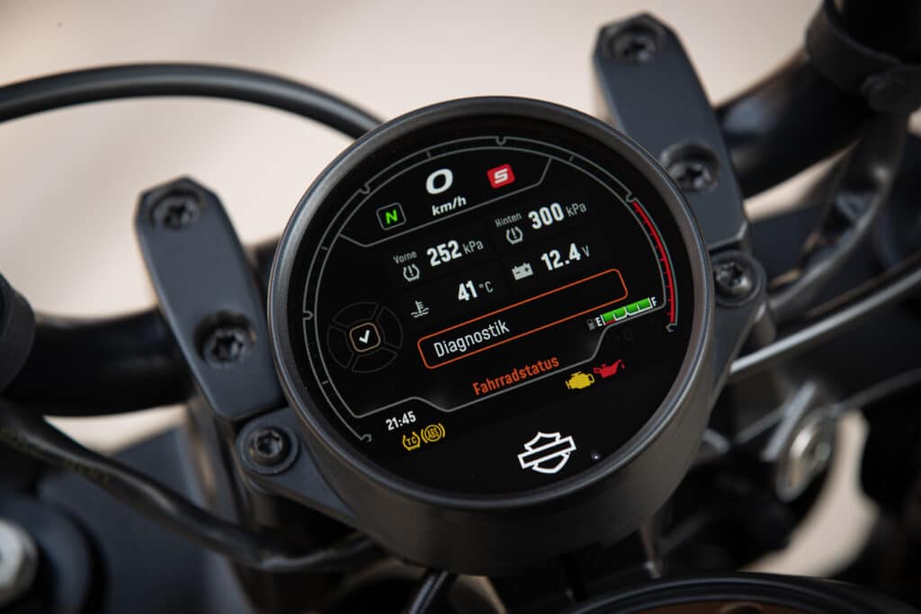 Jest tu jej na tony. Co prawda w stosunku do Pan Ameriki nie jest (na szczęście w przypadku tego typu motocykla) aż tak bogato. Nie mamy np. asystenta ruszania pod górę czy półaktywnego zawieszenia ze słynnym automatycznym obniżaniem wysokości. Po pierwsze wysokości kanapy tego motocykla (753 mm) nie trzeba obniżać przy parkowaniu nikomu. Po drugie w takim sprzęcie całkowicie wystarcza klasyczny zawias z dobrej półki. Wracając do wyposażenia, silnikiem oraz pracą układu kontroli trakcji i ABS-u zawiaduje taki sam system. Oznacza to, że przepustnice sterowane są „po kablu”, to samo tyczy się zmiennych faz rozrządu trzech predefiniowanych trybów jazdy. Do dyspozycji ridera są także dwa customowe tryby, które możesz ustawić całkowicie pod siebie. Mamy tutaj także pochodzący z wyższej półki układ sześcioosiowych czujników inercyjnych, który pozwala na dostosowywanie pracy kontroli trakcji oraz układu ABS do pochylenia motocykla. Okrągły, kolorowy, czytelny i przyjemny dla oka wyświetlacz TFT nie przysłania świata, jest czytelny nawet w słoneczne południe i daje szybki wgląd we wszystkie podstawowe funkcje motocykla. Przegrzebując się przez rozbudowane menu można znaleźć sporo opcji. Wśród nich nie zabrakło łączności z telefonem i korzystania z oraz obsługi jego funkcji nawigacyjnych i multimedialnych. Potrzebna do tego jest specjalna dedykowana aplikacja. Jest więc tego naprawdę sporo. Zwłaszcza jak na raczej miejski motocykl typu custom. Sportster S jest także fabrycznie przygotowany pod instalacje grzanych manetek.