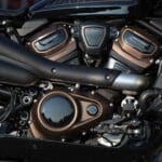 Nowością jest także użycie przeróżnych materiałów w nieznanych do momentu premiery Pan Ameriki proporcjach. Sportster S nie jest już żelaznym rumakiem. Mamy tu sporo aluminium, stali nierdzewnej i tworzywa. Czy przez to motocykl staje się mniej prawdziwy? Dla mnie nie, bo choć metalowe wypraski w postaci błotników, czy zbiornika paliwa mają w sobie „to coś”, to zawsze płacimy za to cenę w postaci mniejszej lub większej nadwagi. Harley-Davidson przyzwyczaił nas oczywiście do tego, że musi być siermiężnie i ciężko, jednak zdaniem CEO Jochena Zeitza nadszedł już czas by marka wypłynęła na szersze wody. Ciekawym jest, że w przypadku takiej Hodny Rebel, nikt nie ma pretensji, że to i owo jest z tworzywa. W przypadku Harleya na pewno znajdzie się więcej osób, które będą nad tym kręcić nosem. Tak samo jak nad chłodzeniem cieczą, czy bogatym pakietem zaawansowanej elektroniki. Nie da się nie zauważyć, ze pomimo dopakowania różnymi systemami, które przecież też swoje ważą, nowy Sportster, z wagą 228 kilogramów, plasuje się na bardzo przyzwoitym poziomie, który w połączeniu z nisko umieszczonym środkiem ciężkości i kanapą oraz rybami jazdy, pozwoli niemal każdemu dać się bez problemu ogarniać. Zwłaszcza, że zespół H-D przygotował np. takie dodatki jak podnóżki przesunięte do tyłu, mocowane na specjalnych stelażach do konstrukcji silnika.