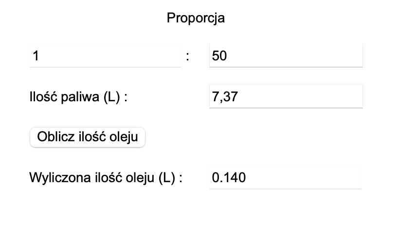 Stosunek ów podawany jest zawsze w taki sposób, że informuje o tym ile litrów paliwa przypada na litr oleju, tj. np. 1:30. Taki stosunek informuje o tym, że jeden litr oleju przypada na 30 litrów benzyny. Zatem to ile oleju należy dolać do paliwa zależy nie tylko od samego stosunku jaki zaleca producent, ale także od ilości zatankowanej benzyny. Najlepszym, najbezpieczniejszym i najbardziej dokładnym sposobem jest przygotowanie mieszanki przed wlaniem jej do zbiornika paliwa. Wówczas do odpowiedniego kanistra wlewamy zadaną ilość benzyny i zgodnie z deklarowanym przez producenta pojazdu stosunkiem paliwa do oleju dolewamy poprawną ilość oleju. Do odmierzania ilości oleju służą specjalne naczynia lub pojemniki z dokładną podziałką. Jeżeli jest to stosunek 1:50 to oznacza że na każde 5 litrów benzyny potrzebujemy 100 ml oleju. Z tego wynika, że na litr paliwa przypada 20 ml oleju. Mnożymy ilość litrów benzyny przez te 20 ml i wychodzi nam dokładna ilość oleju jaką trzeba wymieszać z paliwem. To bardzo proste i wymaga od właściciela motocykla przede wszystkim znajomości pojemności zbiornika paliwa, a także zakupu odpowiedniego pojemnika z podziałką oraz kanistra. To najłatwiejszy sposób, aby dobrze przygotować mieszankę jeszcze przed rozpoczęciem jazdy, aby uniknąć bardziej skomplikowanych obliczeń.