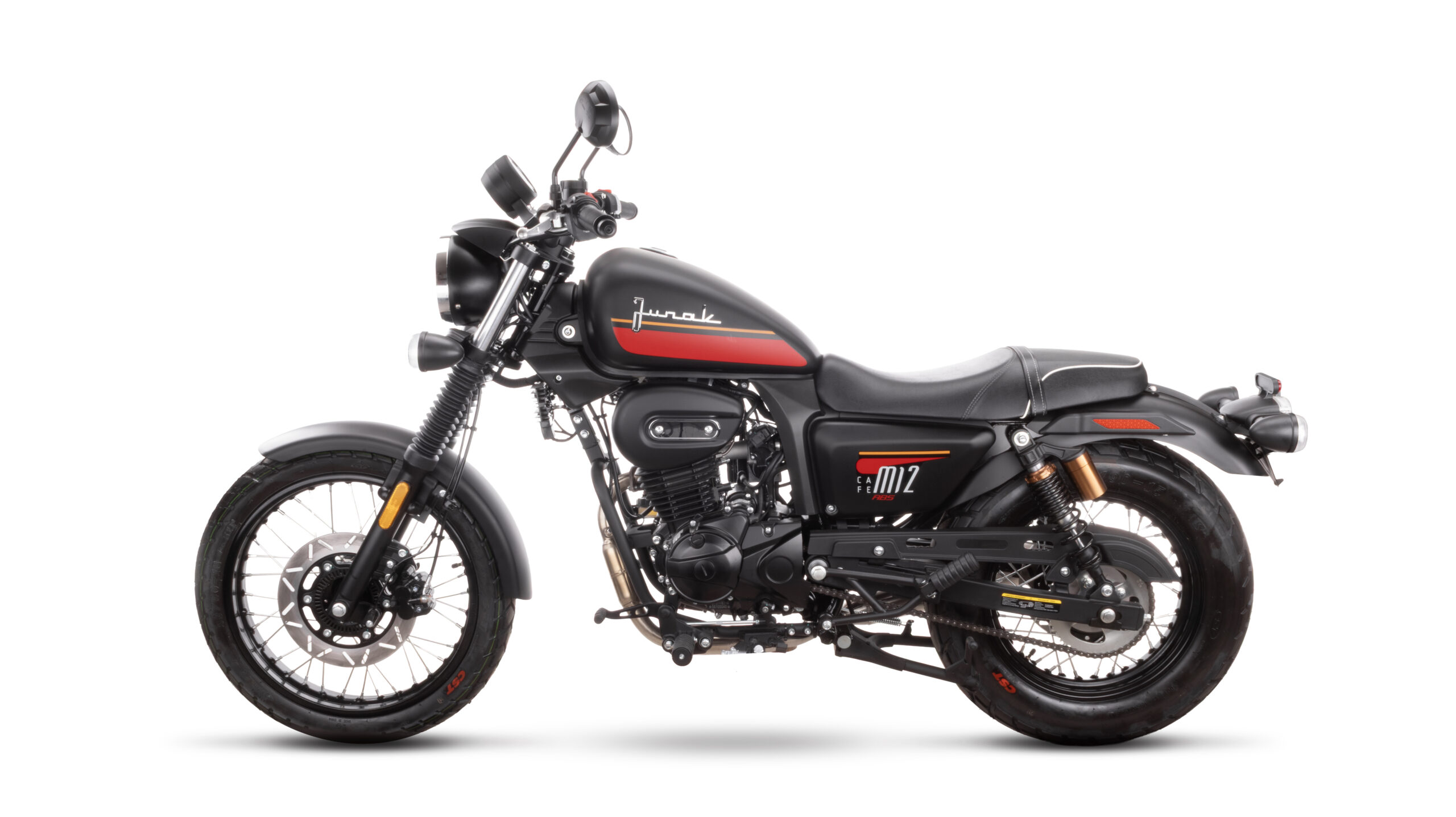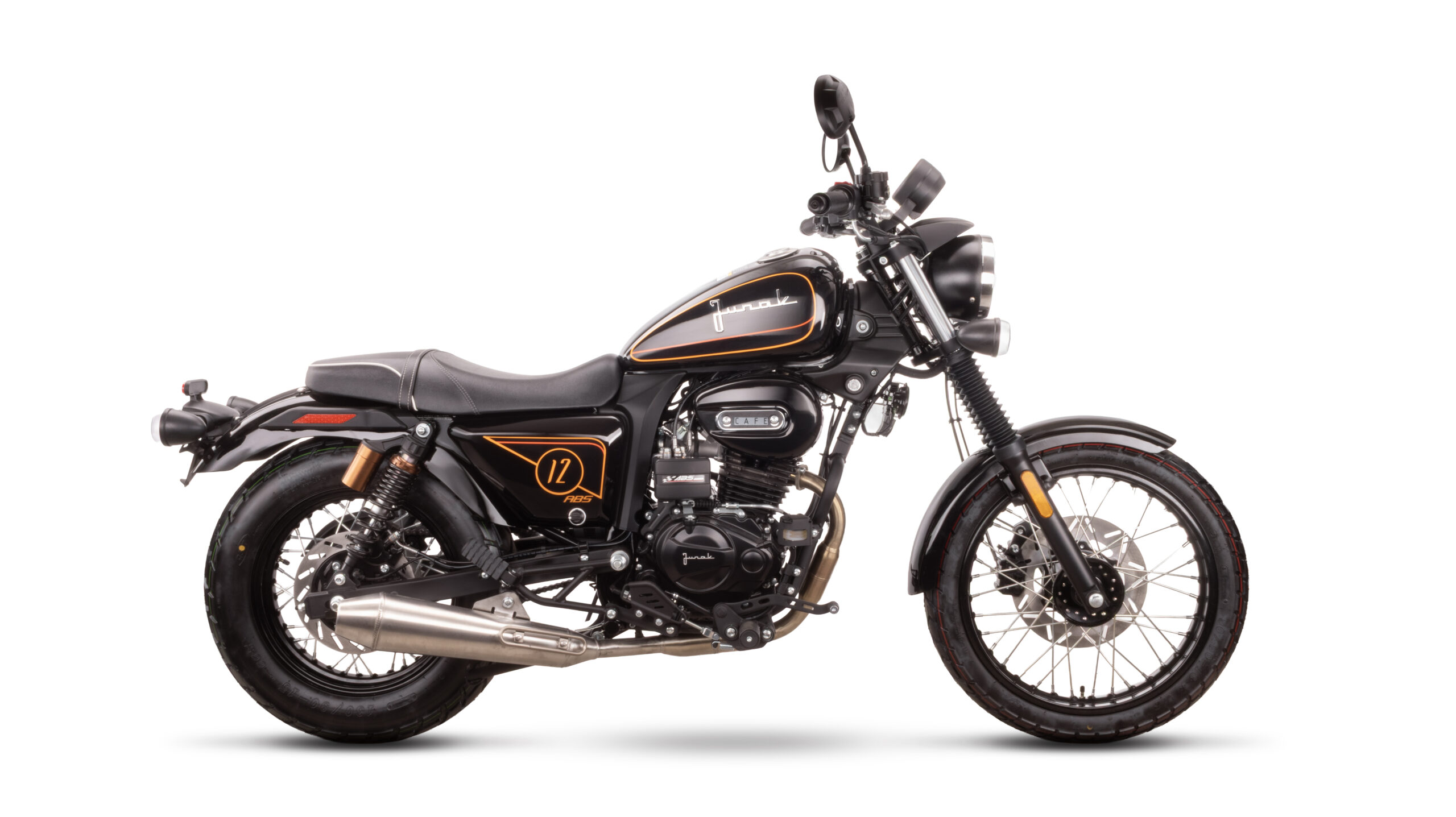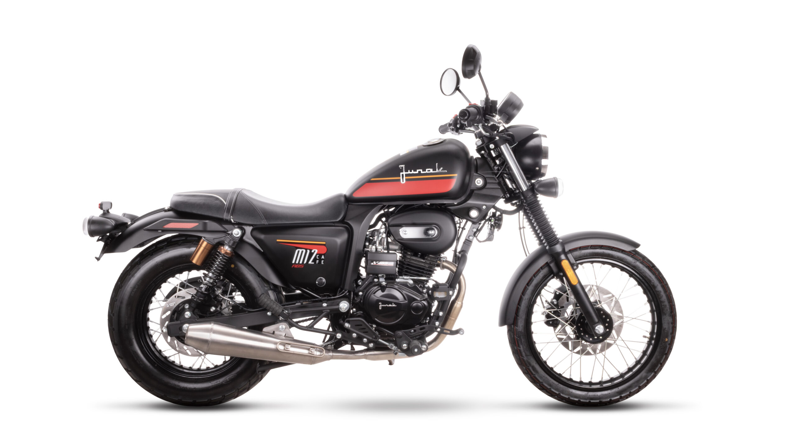Pod względem stylistyki Junak M12 Café ABS nie odbiega od swojego poprzednika. Postanowiliśmy zachować jego klasyczny design, który jest kwintesencją café racera – nisko poprowadzona kierownica, smukła linia zbiornika, szprychowe koła i charakterystyczne detale tworzą spójną całość, która przyciąga spojrzenia.