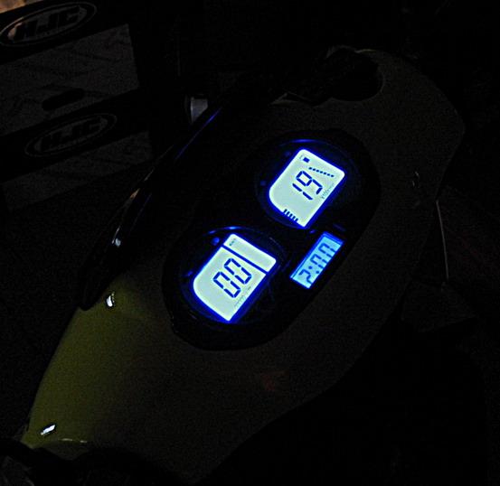 Kokpit. Zegary są ładne i czytelne. Oprócz prędkościomierza zobaczymy również: obrotomierz, wskaźnik ilości paliwa, ilości oleju oraz miernik poziomu naładowania akumulatora. Po za tym skuter wyposażony jest bardzo przydatny gadżet: cyfrowy zegar, dzięki któremu nie musimy patrzeć na nasz zegarek na ręce czy też telefon komórkowy, co zwiększa nasze bezpieczeństwo.