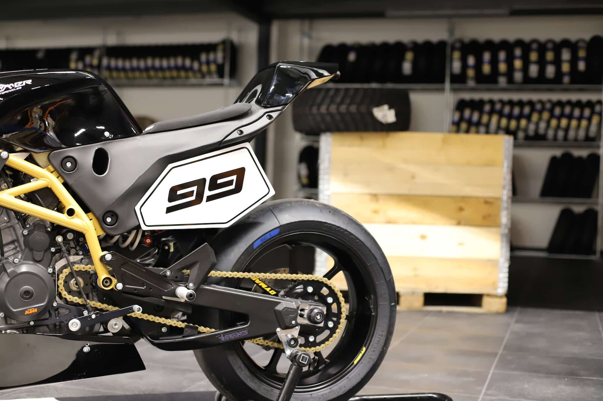 Już na pierwszy rzut oka widać jednak, że GP2-890R Hooligan to nie jest jedynie wizualnie przerobiony 890 Duke R, a pełnoprawna maszyna wyścigowa, która stworzona została, aby wygrać amerykańską serię. Zresztą bazą do jego produkcji był wyścigowy model GP-890R, który jest pełnoprawnym motocyklem wyścigowym z owiewkami. Na liście wyposażenia znalazł się najbardziej sportowy układ hamulcowy dostarczony przez firmę Brembo, a sama pompa to prawdziwy majstersztyk, czyli maksymalnie wydajna i dokładna RCS Corsa Corta. Dodatkowo na pokładzie są również obręcze Dymag UP7X, pełne zawieszenie WP Apex Pro, regulowane mapy silnika oraz pracy przepustnicy, a także owiewki wzmocnione włóknem szklanym. Ma być lekko i wyjątkowo szybko.