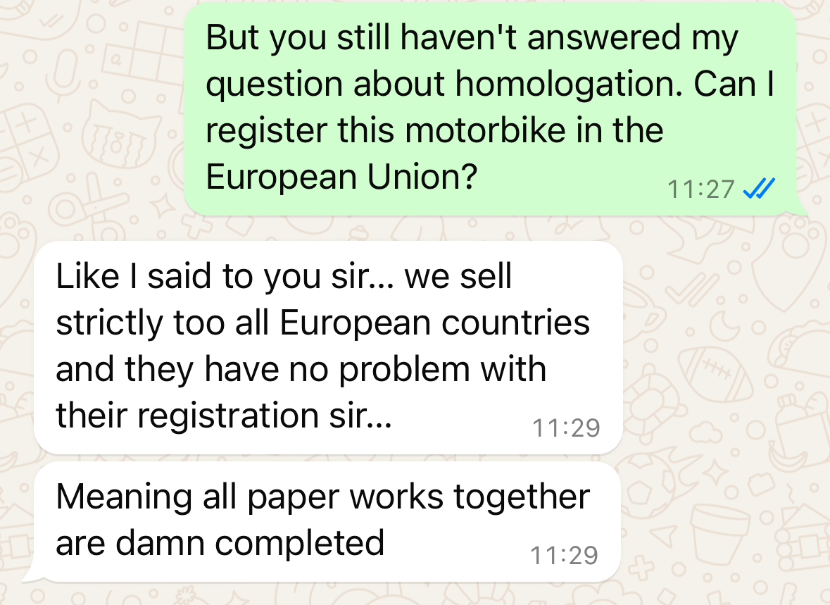 Pozostała jeszcze kwestia rejestracji – zapytałem również o nią. Sprzedawca odpisał, że na 100% mój przyszły nabytek zarejestruję w Polsce i niepotrzebnie się martwię, bo jestem w dobrych rękach. Oczywiście wszystkie dokumenty niezbędne do rejestracji są, a firma setki sztuk wysłała już do najróżniejszych krajów europejskich i nigdy nikt nie skarżył się na problemy z zarejestrowaniem. Poprosiłem o przesłanie zdjęcia dokumentów homologacyjnych, jednakże otrzymałem odpowiedź, że nie mogą one zostać wysłane, gdyż są to dane poufne. Otrzymam je dopiero w momencie, gdy zamówię motocykl. Na powyższą wiadomość nie odpisałem, a następnego dnia kilka minut po godzinie 9 otrzymałem powiadomienie z WhatsApp. Sprzedawca z Chin wysłał mi zdjęcie, które mogłem otworzyć tylko raz i znikało. Przygotowałem zatem drugi telefon, aby uwiecznić nadesłany dokument. Wyglądał całkiem nieźle, ale jest z 2021 roku. Zawierał numer VIN, dokładne dane motocykla, a także potwierdzenie zgodności z unijnymi dokumentami o nazwie e13*167/2013*00208*02. Niestety dotyczył quada.