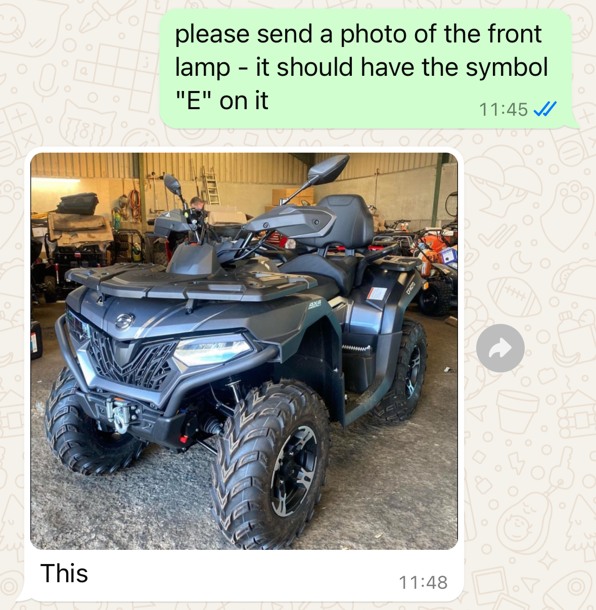 Wpadłem zatem na pomysł, aby poprosić o przesłanie kilku zdjęć reflektora, na którym powinien znajdować się symbol homologacji E wskazujący, że lampa może być używana na terenie Unii Europejskiej. Fotkę otrzymałem, ale znajdował się na niej quad w całej okazałości, więc albo sprzedający nie chciał mi jej przesłać lub liczył, że po zdjęciu średniej jakości sam dojrzę niewielką literkę ukrytą pod folią ochronną.
