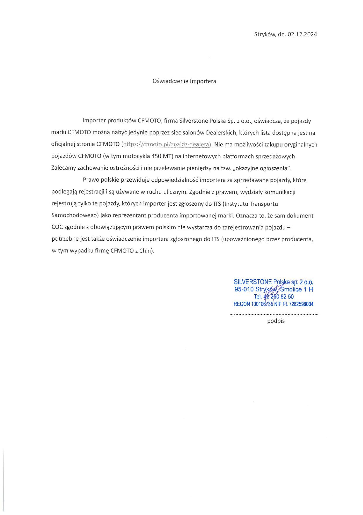 Importer produktów CFMoto, firma Silverstone Polska Sp. z o.o., oświadcza, że pojazdy marki CFMoto można nabyć jedynie poprzez sieć salonów dealerskich, których lista dostępna jest na oficjalnej stronie CFMoto (https://cfmoto.pl/znajdz-dealera). Nie ma możliwości zakupu oryginalnych pojazdów CFMoto (w tym motocykla 450 MT) na internetowych platformach sprzedażowych. Zalecamy zachowanie ostrożności i nie przelewanie pieniędzy na tzw. „okazyjne ogłoszenia.”