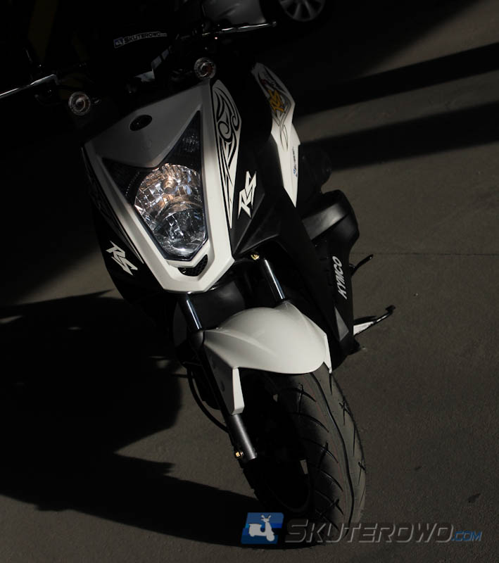 Tym co widać na pierwszy rzut oka. Bardzo fajnie wyprofilowana kierownica, nieosłonięta, jak to w klasycznym skuterze plastikami. Metalowa rura trzymana przez centralny uchwyt z wytłoczonym logo Kymco. Na tym osadzone zegary, które wyglądają naprawdę świetnie, zwłaszcza w porównaniu do zwykłego Agility – tam była tragedia… Na kierownicy i kokpicie w zasadzie zmiany się kończą. Reszta nie różni się od protoplasty. to ten sam skuter.