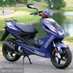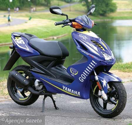 Ten trochę przydługi wstęp miał nakreślić sens ograniczenia osiągów w motorowerach, bo przecież ma być testowany skuter o pojemności skokowej 50 ccm. I to jaki skuter! Yamaha Aerox Race Replica. Jednak na wieść, że znowu mam podróżować pięćdziesiątką, nie wpadłem w cielęcy zachwyt. Cóż, był czas przywyknąć – rzekli koledzy, uśmiechając się dziwnie. Naczelny też nie był lepszy – Aerox w wersji limitowanej to górna półka skuterków, ma sportowe zawieszenie, opony, hamulce i malowanie, a ty wywodzisz się ze sportu, więc będzie ci się podobało. Następnego dnia pojechałem odebrać to cudo. Dużo wcześniej nasłuchałem się o zacięciu sportowym tegoż jeździdełka, jaki to on szybki i w ogóle. Aerox to żadna nowość, produkowany jest od 1997 roku. W wersjach limitowanych zmieniano jedynie malowania i naklejki upodabniające skuter do motocykli wyścigowych mistrzów. Ten jest w malowaniu motocykla Valentino Rossiego, czyli Yamahy YZR-M1 MotoGP 2004. Całość wygląda estetycznie i bardzo atrakcyjnie, wręcz odjazdowo. Piękne niebieskie plastiki oklejone żółtymi i białymi naklejkami reklamowymi i numerem startowym samego mistrza sprawiają wrażenie, jakby dopiero co wyjechał z boksu zespołu fabrycznego. Sylwetka jest, jak widać, ponadczasowa, choć pojazdy o stylistyce sportowej zazwyczaj starzeją się najszybciej. Nadal na czasie i nadal agresywnie sportowa.