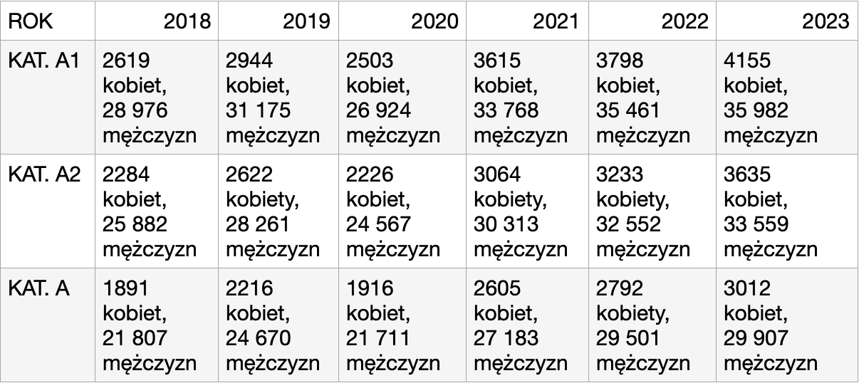 - W 2023 roku motocyklowe prawo jazdy otrzymały 10 802 kobiety oraz 99 448 mężczyzn.