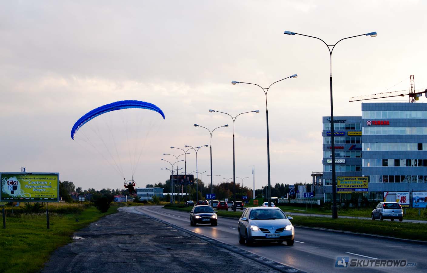 Jak Wam wspominałem naszym celem była nie tyle sama podróż, co kształcenie swoich umiejętności fotografowania. Stojąc na poboczu Jerozolimskich naszym oczom ukazała się motolotnia. Niebezpiecznie się obniżała, zbliżając się do ulicy. Przez długi czas leciała 4-5 metrów nad samochodami. Byliśmy święcie przekonani, że pilot ma problem ze swoim sprzętem, że spadnie w środek ulicznego ruchu, albo zaczepi się o latarnię. Ten widząc nas podleciał w naszym kierunku. Musiałem aż samemu sobie wydać polecenie „padnij!”. Naprawdę. Do teraz nie wiem, czy to celowo, czy za sprawą braku wprawy motolotniarza.