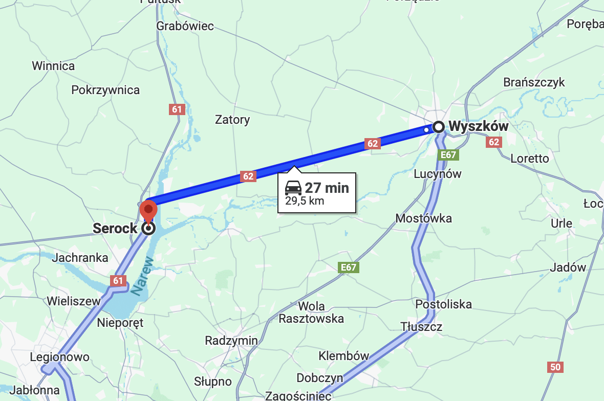 Droga krajowa nr 62 na odcinku pomiędzy Serockiem, a Wyszkowem, na długość 26 km i nie ma ani jednego zakrętu. To wyjątkowo ciekawe doznanie dla wszystkich zmotoryzowanych, ponieważ takich odcinków w Polsce nie ma zbyt wiele, bo zawsze posiadają mniejsze lub większe łuki. Prosty odcinek drogi rozpoczyna się przy marinie na Zalewie Zegrzyńskim i ciągnie przez kolejne 26 kilometrów aż do ronda w Wyszkowie, gdzie droga krajowa nr 62 spotyka się z Aleją Marszałka Józefa Piłsudskiego i Komisją Edukacji Narodowej. Prosta jak stół.