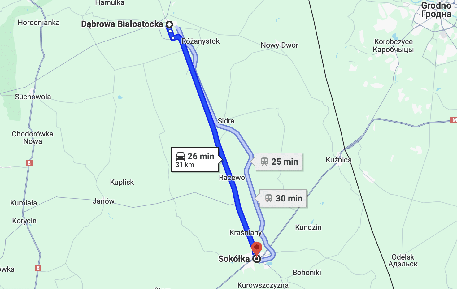 - Bardzo podobny odcinek drogi o długości 26,1 km łączy miejscowości Dąbrowa Białostocka i Sokółka, jednakże posiada kilka łuków i niewielkie rondo.