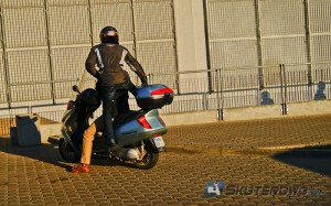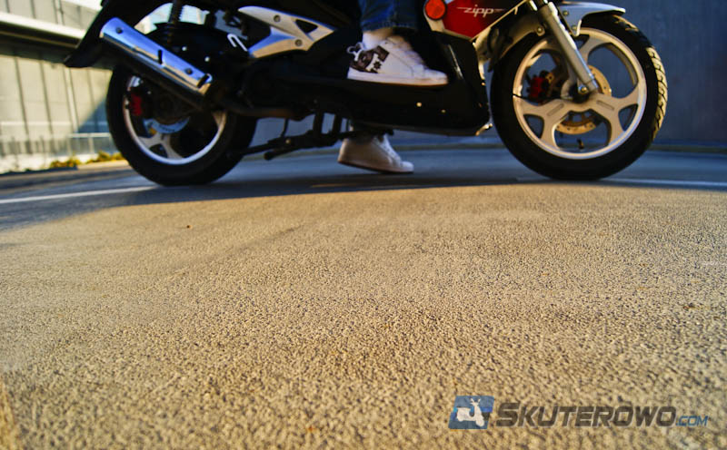 Uwaga na nogi. Kończyny dolne dla skuterzysty to niezmiernie ważne elementy ciała. Dbajmy o nie! Kiedy stoimy, nasze cenne kulasy są najbardziej wystającymi elementami skutera. Warto podeprzeć się nogą od strony bezpiecznej – czyli od tej, od której nie przejeżdżają samochody.