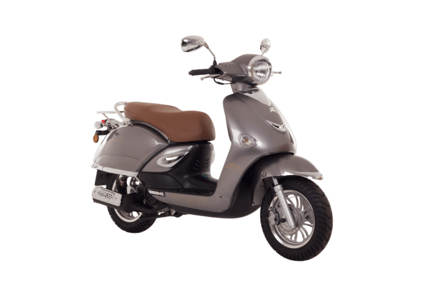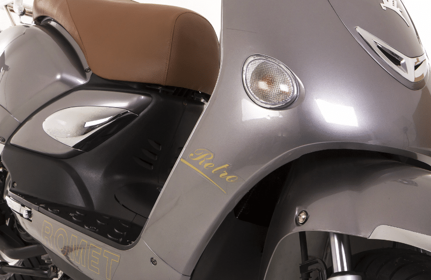 Retro 7 ze stajni Rometa to skuter, w którym zakocha się każdy fan klasyki. Przepiękna linia nadwozia w połączeniu z chromowanymi elementami tworzy wyjątkowy efekt. Brązowa kanapa świetnie komponuje się z całością i podkreśla jego charakter. Przednia lampa umieszczona wysoko na kierownicy dobrze oświetla drogę. Nad bezpieczeństwem kierującego i jego pasażera czuwają hamulce, z przodu tarczowy, z tyłu – bębnowy. 12’calowe koła co prawda nie należą do największych, jednak dostatecznie tłumią nierówności.