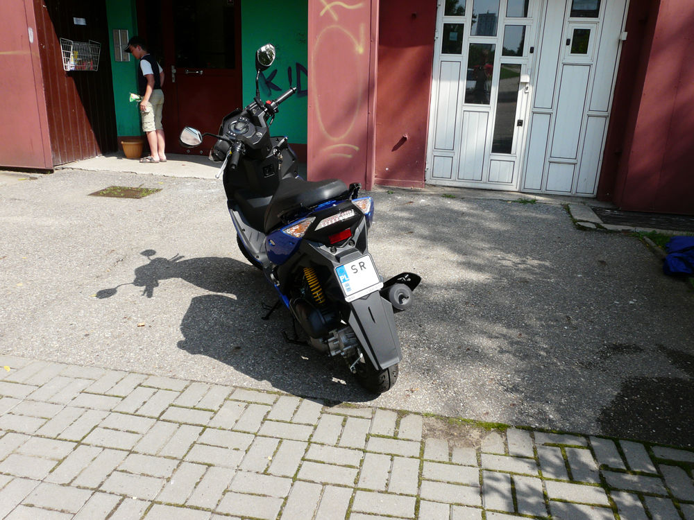 Wygląd. Nie będziemy tutaj dyskutować o tym czy jest ładny czy nie, bo to już jest kwestia gustu i myślę, że każdy sam sobie odpowie na to pytanie. Z przodu skuter ma duże światła, które nadają mu agresywności. Kierunkowskazy są ładnie wkomponowane w kierownicę, więc gdy robi się ciemno, widać je doskonale. Z tyłu można dostrzec bardzo ładnie dopasowane klosze lamp i LEDowe światło stopu. Skuter jest również wyższy od większości innych skuterów, na których jeździłem (Kymco Vitality, Kymco Super 9, Sym Mio) co jest plusem.