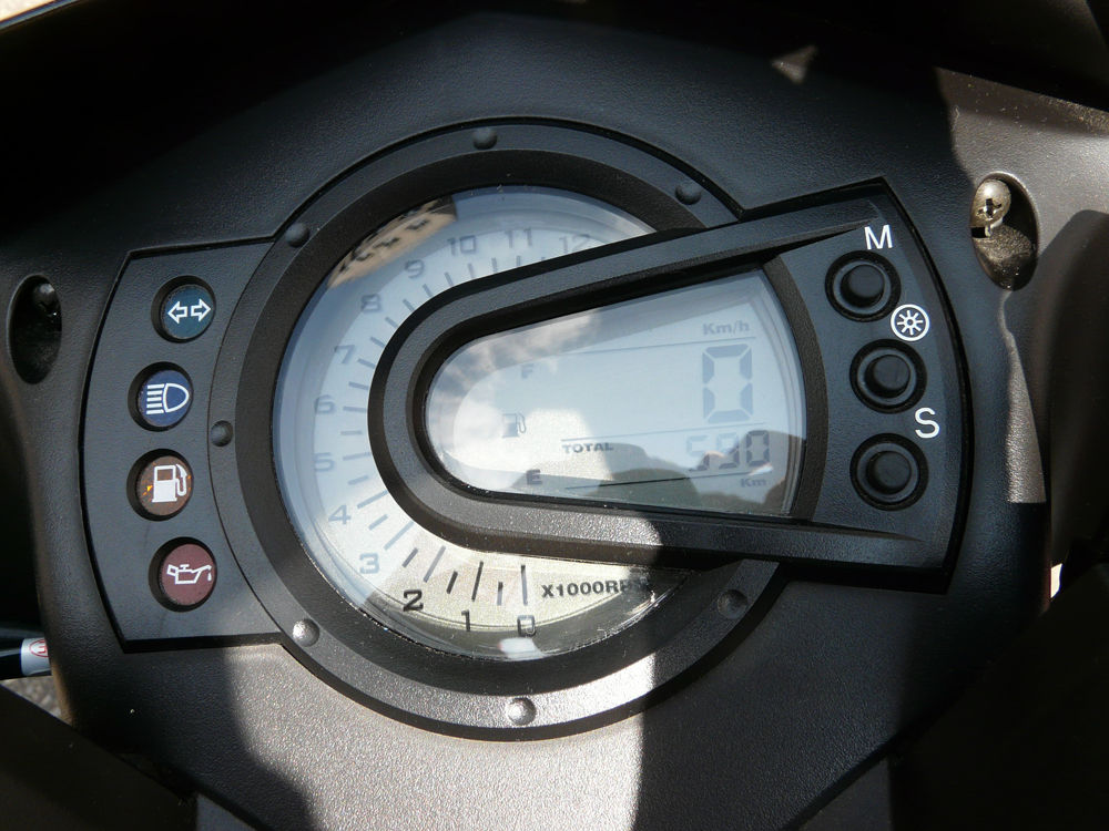 Deska rozdzielcza i kierownica. Wszystkie dane (prędkość, przebieg (całkowity i dzienny), obroty, godzina i ilość paliwa w baku) są wyświetlane na wyświetlaczu ciekłokrystalicznym(LCD) podświetlanym na pomarańczowo. Po prawej stronie od wyświetlacza są 3 przyciski oznaczone literami: