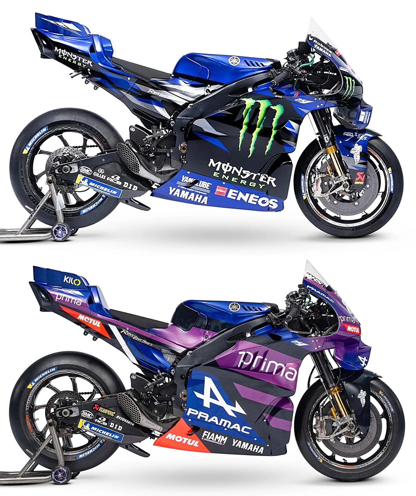 Yamaha przechodzi ogromne zmiany, nie tylko w kwestii technicznej, ale również personalnej. Fabio Quartararo pozostaje liderem fabrycznej ekipy, a dołącza do niego Alex Rins, który po trudnym okresie w Hondzie chce wrócić do czołówki. Nową satelicką ekipą Yamahy jest Prima Pramac, która postawiła na Jacka Millera i Miguela Oliveirę. Yamaha Factory zachowała tradycyjne ciemnoniebieskie barwy Monster Energy, podczas gdy Pramac Yamaha otrzymał bardziej dynamiczne malowanie z białymi i fioletowymi akcentami.