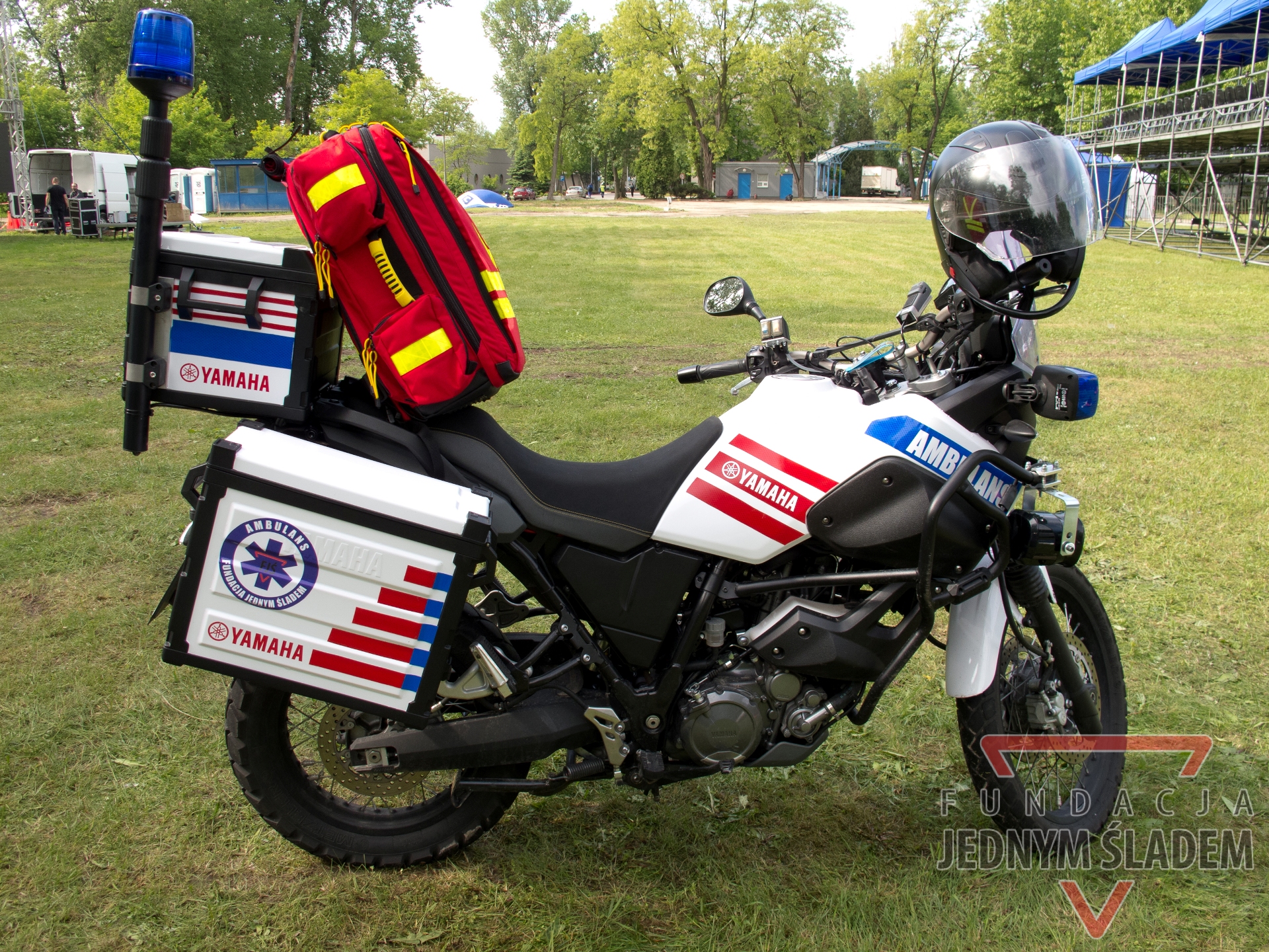 2014.05.17-Yamaha-Moto-Ambulans-Crash-test-PIMOT-1-of-6MotoAmbulans to motocykl Yamaha Tenere XT660Z z pełnym osprzętem wymaganym dla pojazdów uprzywilejowanych – emituje on podczas swojej służby sygnały świetle i dźwiękowe. Ponadto na pokładzie tej maszyny jest defibrylator oraz specjalistyczne kufry służące do przewozu m.in. krwi, osocza i próbek laboratoryjnych. Ten wyjątkowy motocykl wyjeżdża na drogi wtedy, kiedy niezwykle istotny jest czas. Jednoślad ten jest bezkonkurencyjny w porównaniu ze zwykłym ambulansem, zwłaszcza jeśli za jego kierownicą znajduje się świetnie wyszkolona człowiek.