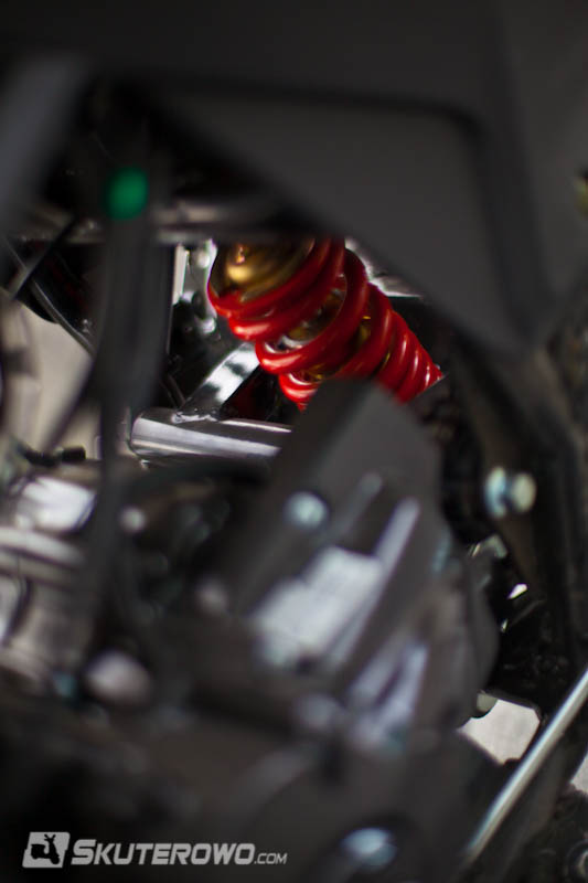 Po kilkunastu kilometrach możemy ocenić zawieszenie. Przednie lagi mają duży zakres pracy i przez to dobrze wyłapują dziury. Z tyły jest jeden, centralny amor. Dobrze wygląda i pracuje. Nieco gorzej się ma kiedy jedziemy w dwie osoby.